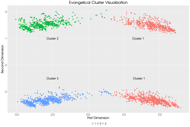 As is apparent from the evangelical Protestant visualization, clusters 2 and 3 are highly concentrated, but cluster 1 is bifurcated. That division is over the issue of biblical literalism. Cluster 2 (green) is 100% biblical literalists, Cluster 3 (blue) is less than 1% literalists. Cluster 2 (red) is 57% literalists. This cluster also falls in the middle of church attendance, support for abortion, political tolerance, and support for homosexual relations. This algorithm has determined that if one wants to break evangelicals into camps, their view of the bible is a perfect place to start.