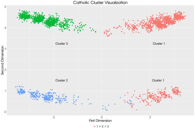 The mainline Protestant clustering is not as clear as their evangelical counterparts and the clusters are not nearly coherent for this group. From a theological point of view Cluster 1 (red) is the most liberal, while Cluster 2 (green) is the most conservative, and Cluster 3 (blue) is the middle. But even the most conservative cluster is only 36.1% literalist, compared to evangelicals who have a cluster at 100% literalists. In general, Cluster 1 is more progressive in a number of ways. They are more supportive of gay marriage and abortion. They are also younger, more highly educated, and attend church less frequently. But in general, these differences are not large which is why the clusters are not densely packed.