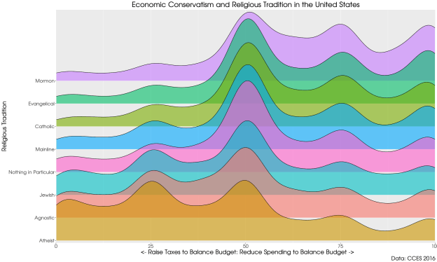 The Cooperative Congressional Election Study (2016) has an interesting question that boils economic policy down to its essence. “If your state were to have a budget deficit this year it would have to raise taxes on income and sales or cut spending, such as on education, health care, welfare, and road construction. What would you prefer more, raising taxes or cutting spending.” 1 indicates that the deficit should be corrected entirely through tax increases, 100 is closing the deficit by spending cuts alone.