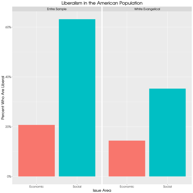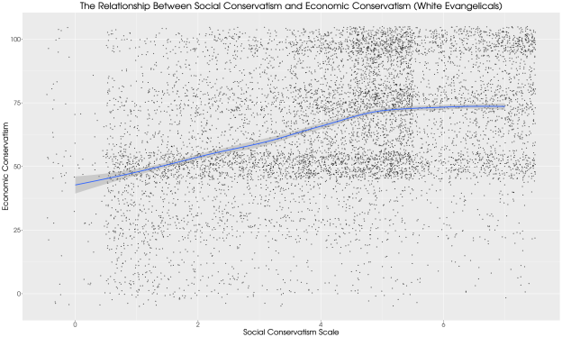The CCES asks respondents about abortion in six different scenarios and included a question about support for same-sex marriage. The seven questions were combined to create an additive scale of social conservatism with zero being completely liberal and seven indicating the highest level of social conservatism. Using the previous economic issue question as well as the social conservatism scale, the bar graph above displays which portion of the entire sample are social or economic liberals in the left panel. The same analysis is conducted with just white evangelicals in the right panel. I defined liberalism as anyone below the midpoint for either scale. The differences in economic policy positions between the two groups is miniscule, just 6%. However a tremendous gulf exists on social issues: about 35% of white evangelicals are social liberals, while 63.2% are left of center in the entire population. I then combined each of these two measures into a single scatterplot. This plot has social conservatism on the X axis and economic conservatism on the Y axis. In addition a LOESS model was added by the blue line. Obviously the relationship is a positive one: the more economically conservative, the more socially conservative. Or the relationship could be the other way. For every point an individual moves up the social conservatism scale, they become 5.8% more economically conservative. Notice however there is a flattening out of the line once you reach around 5 on the social conservatism scale. That is the point when one does not become economically conservative. Now to consider white, evangelical Protestants.