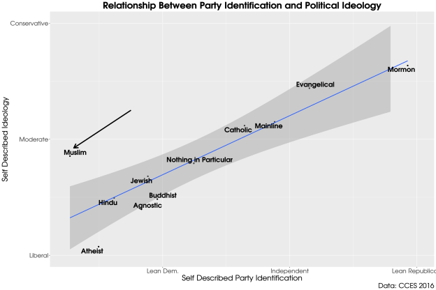 The figure below shows how Muslim self-described ideology lines up with their partisanship. Nearly every group follows monotonically on a line from conservative to liberal matching their Republican to Democratic party affiliation. But Muslims fall substantially off of that line — they are much more moderate than their Democratic leaning would suggest. Interestingly, Atheists are more liberal than their party affiliation would suggest, which follows since they have not been warmly embraced by the Democratic Party.