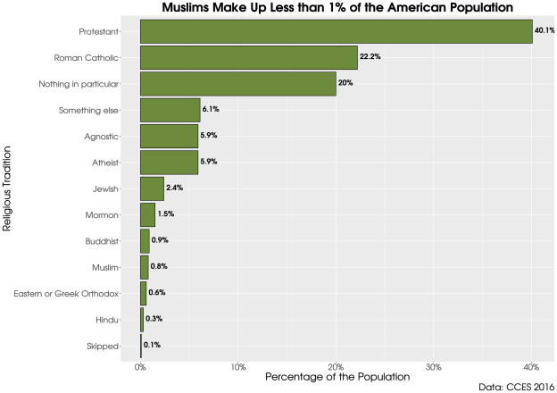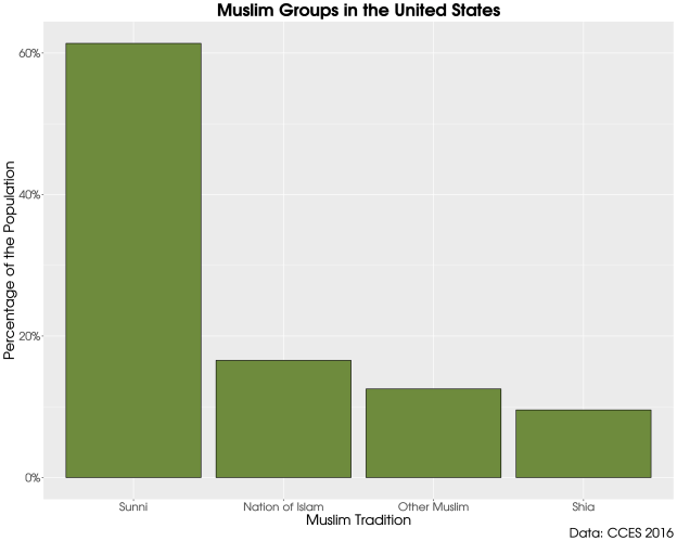 The figure below shows how the different Muslim denominations are distributed in the US and the pattern resonates with world distributions – a majority are Sunnis, with Shia Muslims a distant fourth. A source of some of the most severe conflict in the Middle East, Sunni (e.g., Saudi Arabia, Iraq) and Shia Muslims (e.g., Iran) disagreed initially over who should have succeeded the prophet Muhammed in the 7th century after his death (the latter argued for a blood relative) and have since differentiated themselves in other consequential religious and geopolitical ways. Of course, the Nation of Islam is also represented as an original American creation – an Islamic organization created by and for African Americans. Previous estimates have pegged the NOI at a quarter of the Muslim population, which is not far off the mark of 19% of Muslims in the US in 2016.