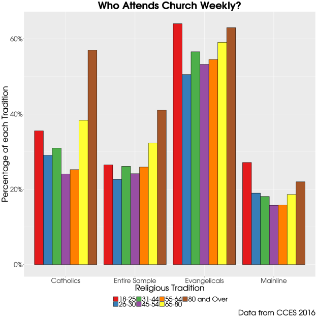 The above graph displays the percentage of respondents who report they attend church weekly from three major Christian traditions(as well as the entire CCES sample) broken down into seven different age categories. As is quickly evident, evangelicals go to church a lot. In fact, there was no evangelical age group where less than 50% attend church weekly. That is clearly an outlier when comparing evangelicals to mainline Protestants or Catholics. Notice for basically every religious tradition the relationship between age and attendance is bi-modal, meaning it’s high on the ends and then dips in the middle. For both Catholics and mainliners this is pronounced. So it seems that the return to church doesn’t necessarily happen once these individuals move into adulthood and begin having children. How do these attendance differences look comparing a number of religious traditions?