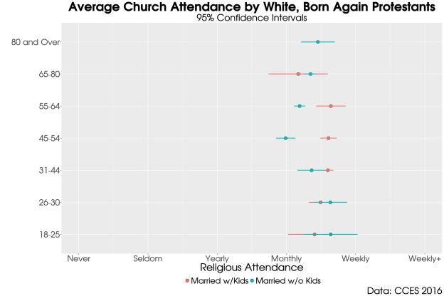There is a clear divergence that occurs, but only later in life. However, that difference might be due to the nature of the question: remember it asks individuals if they a child under the age of 18. For many individuals who raise children, they move into adulthood and leave the house when parents are in their mid 40’s-late 50’s and maybe that’s an explanation for the results here. Individuals still attend until their children leave the nest and then parental attendance suffers as a result.