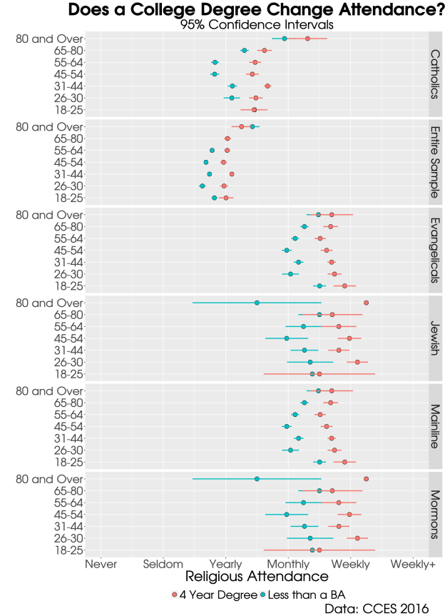 Here the results are unambiguous. A college education does not make anyone less religious. There is no evidence to support that idea. At all. In fact, just the opposite. In all five of the major traditions I analyzed including the entire 64,600 CCES sample there is no single age bracket where someone without a degree attends more than someone with a degree. There are times when they are statistically indistinct, but that’s it. We’ve talked about that before, but it bears repeating.