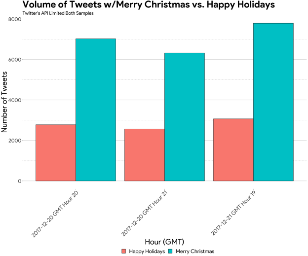 It would be really nice to compare the usage of these two phrases on Twitter this Christmas and then in December of 2015 before Donald Trump put such an intense spotlight on the phrase to see how things have changed. Alas, to acquire tweets from that time frame would cost thousands of dollars. However, as more researchers begin to collect their own personal Twitter datasets, research like this could take off, leading to a whole new wave of scholarship in the social sciences.