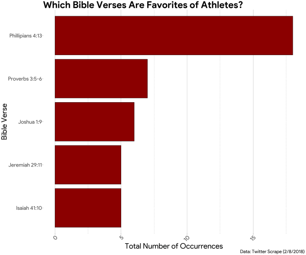 So, which verses do athletes prefer? The clear winner is from the letter to the Philippian church when Paul writes, “I can do everything through Him who gives me strength.” Another popular choice was Proverbs 3:5-6, “ Trust in the LORD with all your heart and lean not on your own understanding, in all your ways acknowledge him, and he will make your paths straight.” Other popular selections are from the book of Joshua, “Have I not commanded you? Be strong and courageous. Do not be terrified; do not be discouraged, for the LORD your God will be with you wherever you go.” These verses are not just popular with athletes, by the way. In fact these verses are all listed on the top 100 most read verses on Bible Gateway, the most popular Bible site on the internet.