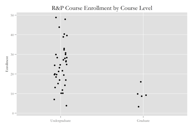 Enrollments are probably what you expect given that many of those teaching are at liberal arts colleges and R&P courses tend to be upper-level and thus are attached to lower course caps. The average undergraduate course size is 26, while the size of the average grad class (from the 5 of them) is 9. Given that the size of the R&P section is probably in the 400s these days, exposing 45 graduate students to R&P every few years is not insignificant.