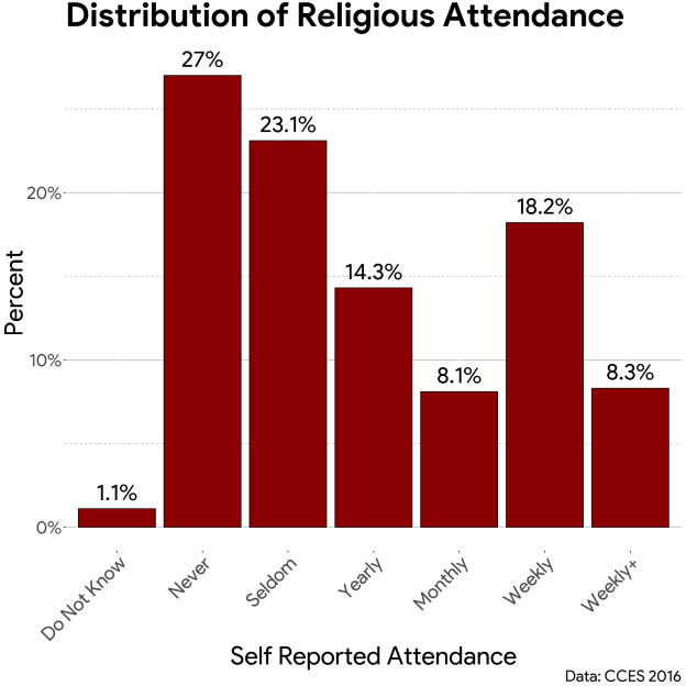 The figure above displays the distribution of religious attendance in the Cooperative Congressional Election Study (2016). To begin at the low end of the scale, consider that about half of Americans go to church less than once a year. Taken from this perspective, just attending religious services once a month is a little bit unusual (just over 1 in 3 Americans do so). But to move to the right of the scale it’s apparent that there is a small subset of the population who attends church at least once a week. About one quarter of Americans are weekly church attenders, which includes the just over eight percent who chose the most frequent option — they attend “more than once a week.”