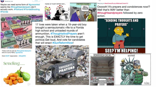 The term “thoughts and prayers” evolved into a political meme when member of Congress began to use the term in the wake of school shootings across the United States. The Twitterverse picked up on it’s usage (largely by Republicans) and used it to point out that tweeting “thoughts and prayers” is no replacement for actually passing gun control legislation. But is that a fair characterization of its usage on Twitter?
