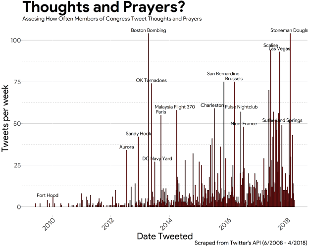 In reality, the term “thoughts and prayers” has been used for a wide variety of tragedies at home and abroad. It is true that many of these tragedies revolve around mass shootings. For instance, the graph above contains spikes for at least ten instances of multiple gun fatalities on American soil. However, that’s not the entire story. “Thoughts and prayers” has also been used for events like the crash of Malaysia Flight 370 or a series of deadly tornadoes that swept through Oklahoma in 2013. Additionally, it was used as a way to acknowledge terror acts in Paris and Nice, France. It was, at least at one point, the go-to phrase for a member of Congress to tweet when something tragic happened.
