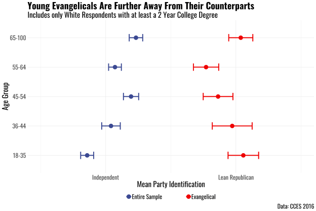 The visualization above displays the mean party identification score for white respondents with at least a 2 year college degree. The dots in blue are the entire sample, and the dots in red are just evangelical Christians. The capped lines represent 95% confidence intervals. It’s clear that there is a tremendous gulf between the two samples at any age. The smallest gap between the groups is among those 45 and 54 years old. And the largest gap might be the most surprising: it’s between individuals aged 18 to 35. On a scale from 1 (Strong Democrat) to 7 (Strong Republican), the distance in the youngest group is 1.2. Said another way: a young, white, educated evangelical is 20% more Republican than a young, white, educated person in general. It is crucial to note, however, that the gulf between these two groups is likely more attributable to the fact that young people, in general, are the most liberal age group in the sample. But it’s also fair to say that young evangelicals are just as conservative (if not more) than any other age group.