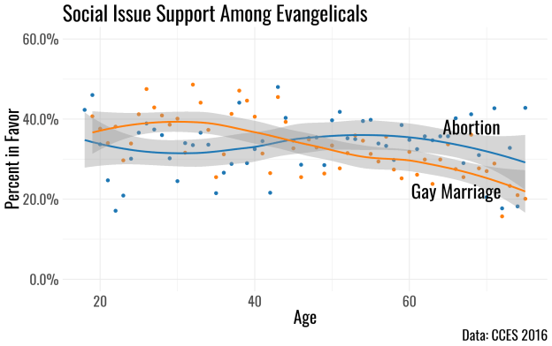 Maybe a difference can be teased out when we observe this phenomenon through the lens of two social issues: gay marriage and abortion. I wanted to see if younger evangelicals are more socially liberal than their older counterparts. Note that this graph is not restricted by age or education due to small sample sizes but includes only those who identify as evangelicals. There is clearly lower support for abortion than gay marriage among young evangelicals. Generally speaking evangelicals under the age of 40 are more likely to support same sex marriage than abortion. But as one moves from the left to the right of the age spectrum, two observations emerge. First, abortion opinion appears independent of age. Young evangelicals are just as opposed to abortion on demand as those in their 70’s. On the other hand there is an age component to gay marriage support with about 40% of younger evangelicals being in favor compared to 25% of those over the age of 70. Keep in mind, however that this support for gay marriage is much below the general population’s support. In the 2016 CCES, 60.7% of those polled expressed support for same sex marriage.