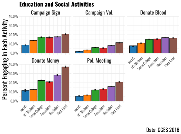It’s important to note that there is a strong relationship between how much individuals engage in those behaviors and how much education they have, which political science has long described. It does make sense that those with a postgraduate degree are more likely to donate money to a political campaign than those who dropped out of high school because of the difference in disposable income. There are other activities, though, that should not see such a stark disparity because they are not so resource-dependent. For instance, giving blood has no costs besides the time to make the donation. While it is likely true that those with higher levels of education have more free time to engage in such activities, that doesn’t seem sufficient enough to explain the fact that the most educated are nearly twice as likely to give blood than those without a high school diploma.
