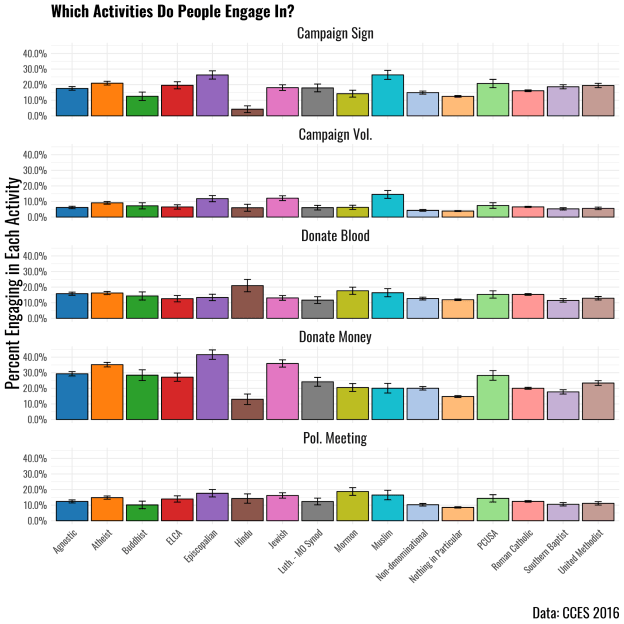To zero in on the hypothesis that church attendance has given way to political activity, the above graph displays the average number of actions engaged, which ranges from zero activities to five total activities. The frequencies again are broken down by 16 religious groups, and further subdivided into self reported frequency of church attendance. Note that for many groups, the difference in means for each level of attendance is not statistically significant. This is evident for the ELCA, Southern Baptists, and non-denominational Christians. One could argue that it is possible that people who have abandoned religion and engage more in politics will change their affiliation on a survey to “no affiliation.” To answer that several groups of religious “nones” were included (atheists, agnostics, and nothing in particular). In no case is therea negative relationship between church attendance and social activities, which would indicate substitution.