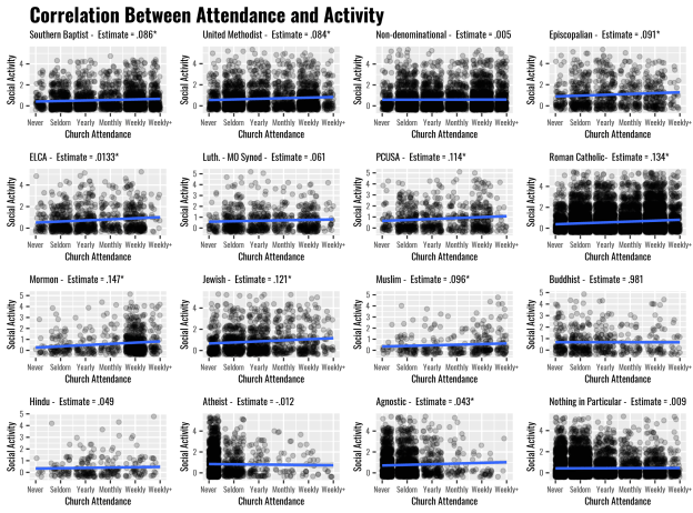To belabor this point, I created scatterplot graphs for each of the sixteen religious groups that contain a blue line demarcating the correlation between church attendance and the amount of social activity. Additionally, the correlation coefficient is displayed at the top of the graph and stars are included when the p value is <.05. Note that for 10 of the 16 groups there is a positive and statistically significant relationship between social activity and church attendance. Said another way: for most of these groups, attending church more is related to engaging in social activities more frequently. For the remaining six groups there is not one with a statistically significant negative relationship between the two variables. To sum up: there is zero statistical evidence that Americans of any religious flavor are replacing their worship attendance with social or political activities. In fact, this analysis provides support for the opposite hypothesis: church attendance is positively related to social engagement.