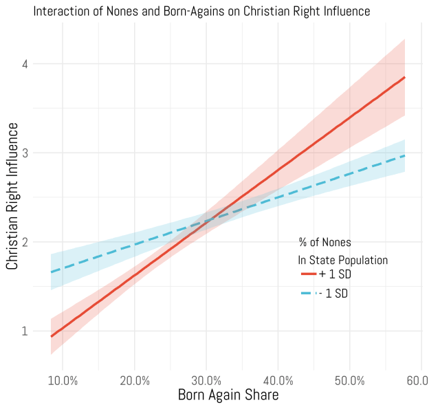 The figure below shows that interaction. More born-again, evangelical identifiers boost the Christian Right presence/influence in the state, a relationship which is intensified by a higher than average rate of nones. The effect of a 2 standard deviation swing is to move Christian Right influence about 25% of the scale – a sizeable effect. In this way, the results showcase how the Christian Right is about representation of a constituency in reaction to forces challenging their privileged position in society and a rapidly fading set of social arrangements.