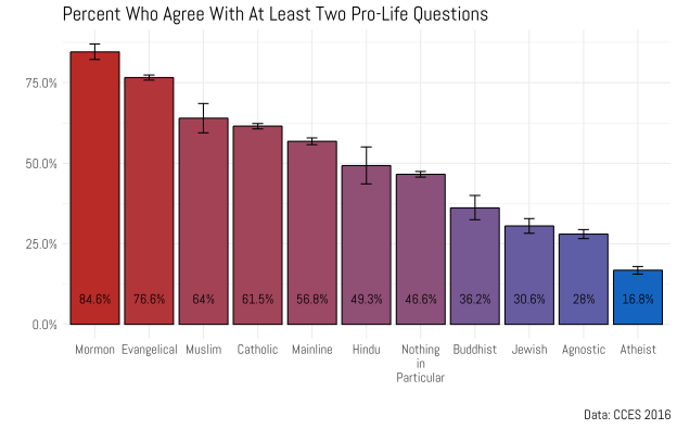 I thought it would be helpful to see in which areas atheists or agnostics were willing to support restrictions on abortion. The above graph displays the percent that support each of the six proposals that were listed in the 2016 CCES. The capped lines represent 84% confidence intervals (comparing any 2 CIs is the equivalent of a 95% significance test.) There is very little difference between the two groups, but by and large, agnostics are slightly more pro-life than atheists. The only issues where some significant traction can be found is a ban on so-called late term abortions (“prohibit after 20 weeks”). A quarter of atheists and nearly forty percent of agnostics agree with this stance. It’s telling that only about 1 in 25 atheists/agnostics support making abortion completely illegal. To put that in a broader context, there were 64,600 people in the 2016 CCES sample, of that figure only 323 were atheists or agnostics who believed that abortion should be completely illegal. That’s .5% of the total sample.