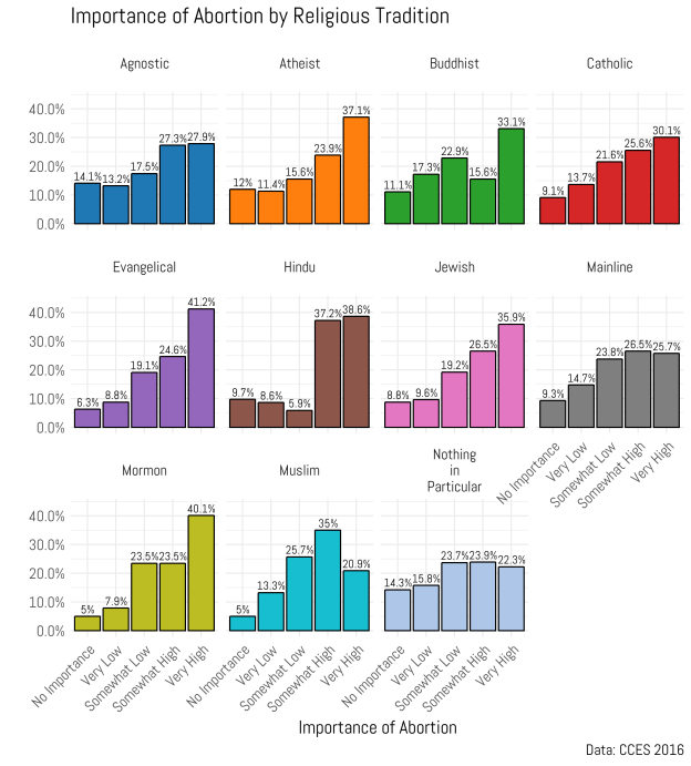 The another thought occurred to me: do atheists really care about abortion as much as Catholics or Mormons? I know that the issue clearly has a religious dimension, so it seems that seculars would shift their attention to some other area of politics/policy. Put another way, when people oppose a policy, then tend to report that it is not important. Luckily the CCES asks a series of questions that ask how important issues are to the respondent ranging from “not important at all” to “very high” importance. The above graph displays the distribution of these responses for ten different religious traditions. Note that 37.1% of atheists think that abortion is very important, while the same is true for 34.3% of Protestants and 40.1% of Mormons. Agnostics are slightly lower at 27.9%, however this number is only slightly lower than the 30.1% of Catholics who think that abortion is very important. What this graph doesn’t tell us is how that importance should translate to policy. Passion for an issue may may be linked to some groups being more pro-life and others more pro-choice.