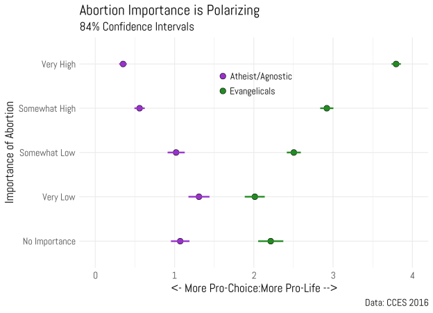 The above graph displays how issue importance (on the y-axis) relates to the pro-life policy (on the x-axis) for atheists/agnostics and evangelicals. I chose evangelicals as the reference category, because they not only place a lot of importance on abortion, but that passion is likely directed toward more restrictions on abortion. That’s exactly what the above graph displays. The bottom of the graph displays that the difference in policy among whose who think that abortion is of no importance only differs by about one point between atheists/agnostics and evangelicals. However as one moves up the graph towards greater levels of importance, the groups polarize. For those atheists/agnostics who think that abortion is of very high importance their mean score was .35, while for evangelicals it was 3.80. It’s clear that when these two groups think that an issue is important, seculars are talking about access and evangelicals are thinking about restrictions on abortion.