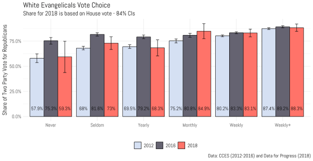 So, it’s best to start at the start. Were white evangelicals less likely to vote for Republicans in 2018? The graph below displays the results from the last two presidential elections from the CCES as well as the new Data for Progress results. Luckily both surveys use the same categories for church attendance making this a true one-to-one comparison. The best way to describe these results is politics as usual. There is no meaningful change to report: white evangelicals are Republicans. There is no significant difference in how white evangelicals who go to church frequently voted between 2012 and 2018. There was no apparent regret in their vote choice after Trump, at least among the most religiously active evangelicals. There could be a case made that less committed evangelicals did turn away from the GOP somewhat in 2018, however given the smaller sample size I wouldn’t place a great deal of stock in that finding until it’s corroborated by other survey data.