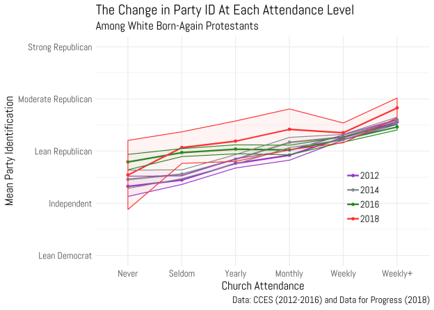 Data for Progress has just released the raw data from their survey that was conducted in November of 2018. That’s unbelievably nice of them. This is the first publicly available dataset from the most recent election cycle. Other surveys such as the CCES and GSS will be released in the next six months, but this data gives us an invaluable peek into what happened in 2018. Just a few caveats, however. This survey did not ask the full range of religious tradition variables that appear in the CCES or GSS. Therefore, I have to resort to using those who identify as born-again Protestants. Fortunately, recent research has confirmed that there is a great deal of overlap between using the RELTRAD and self-identification strategy. Also, the sample size is really good (~3,200), but I am spoiled by the massive sample of the CCES (~65,000). So, the confidence intervals will be larger here and statistical uncertainty is an issue.