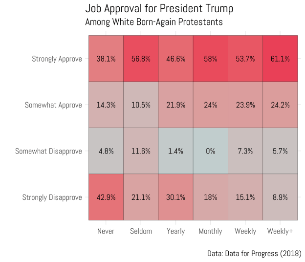 It has become clear that we cannot assume the connection between political orientations and support for Trump among evangelicals, so approval is another important dimension of inquiry. The Data for Progress survey asked respondents “Do you approve or disapprove of the way Donald Trump is handling his job as President?” The heatmap below visualizes how white born-again Protestants responded to this question based on their level of church attendance. The results from their prior two graphs carry over in this one in a clear way. 85% of white born-again Protestants who attend church more than once a week approve of the way Trump is doing his job. That percentage only drops to 77% among those who attend once a week. In fact, even if you go all the way down to those white evangelicals who attend church seldomly, over two thirds still think that Trump is doing a good job. It’s also noteworthy that for the never attending category, 38.1% strongly approve of the job Trump is doing while 42.9% strong disapprove of his job performance.