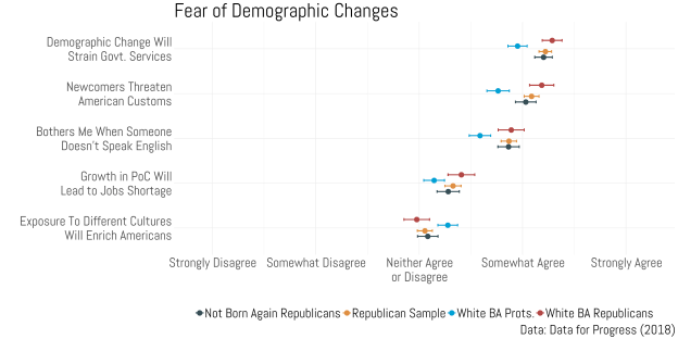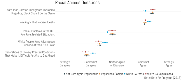 In a previous post, I described the results of data from November of 2018 which indicate that white evangelicals were actually more Republican halfway through the Trump administration, than before he was elected. They show no signs of regretting their decision; if fact it appears they are emboldened by the Trump administration. Nearly 80% of white evangelicals who attended church once a week or more approved of the job that Donald Trump was doing as commander in chief. After writing that post I was struck with a simple thought: is white evangelical just a synonym for Republicans now? Is there any daylight between how a typical Republican feels and how a born-again evangelical feels on political or racial issues? Once again, I turned to the great new dataset available from Data for Progress to try and answer these questions.