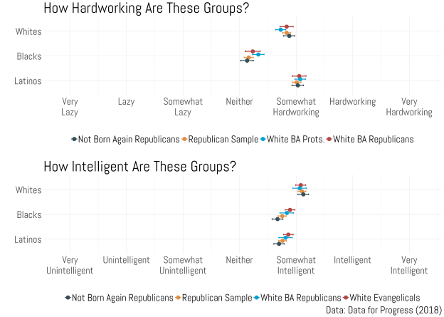 Finally, the survey asked how lazy or intelligent the respondents thought that blacks, whites, and Hispanics were. These questions have a long history in public opinion research as a means to gauge overt prejudice toward minority groups. Here, white born-again Republican were slightly more likely to think that blacks were hardworking and intelligent than Republicans in general, but the differences were not statistically significant. In general, all four groups found Latinos to be more hardworking than whites, but blacks and Latinos were also rated as slightly less intelligent than whites. However, these differences are relatively small.