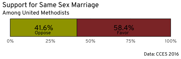 So, what does the average United Methodist think about gay marriage? Fortunately we have a dataset that contains 2,969 United Methodists that was collected by Cooperative Congressional Election Study in October and November of 2016. The graph below is a good place to start: how does the UMC feel about gay marriage? It’s clear that there is a sharp divide. About six in ten United Methodists are in favor of same-sex unions, while four in ten are opposed. These numbers look very similar to the US population, among whom 61.6% were in favor and 38.4% were opposed. So, no matter what decision comes out of the General Conference, a significant portion of rank and file United Methodists will be upset.