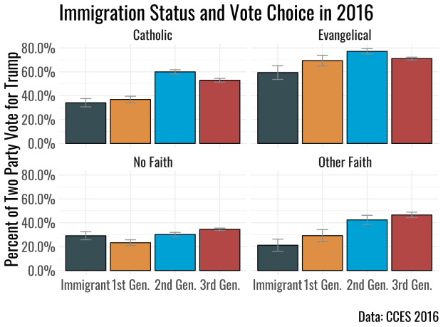 It’s apparent that there are a great deal of evangelical immigrants who attend frequently in addition to the fact that 60% of this same population group supported Donald Trump. It is possible that these two things are related. There are some results that indicate that greater levels of church attendance are related to higher levels of support for the GOP candidate. For those who attended at least weekly, 61% voted for Trump, however for those who attended church between once a month and once a year, a majority favored Hillary Clinton (52%-48%). Evangelical churches hold an interesting position in the lives of immigrants. For many evangelicals coming to the United States, church life creates a conduit to fellowship and a sense of community, but on the other hand that community can have a tremendous impact on the political socialization of recent immigrants. It seems that this situation would be much more acceptable to those who identify as Republicans, while seeming much less palatable to those who oppose Donald Trump. What is not under debate, however, is that religion is a key part of the picture of immigration in the United States.