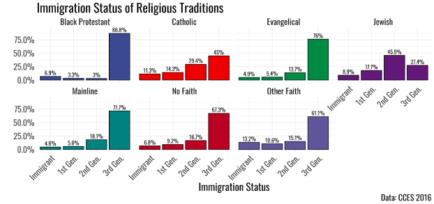 How does that break down by religious tradition? The above graph displays the differences graphically. Note that Black Protestants, Evangelicals, and Mainline Protestants all have below average numbers of recent immigrants. For instance, over 3 in 4 evangelicals say that they are at least the third generation of their family to be American citizens. On other hand, nearly three quarters of Jewish people immigrated to the United States in the last two generations. Note that the group with the highest percentage of immigrants is those of “other faith.” This category contains those who affiliate with faiths like Buddhism, Hinduism, or Islam.