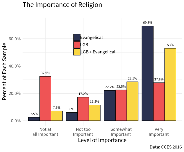 This general idea is called being “cross-pressured.” Picture someone being pushed to the political left on one issue, but then drug back to the right on another one. Cross pressures are everywhere in the religious world. For instance, vast swaths of Catholics use birth control despite the fact that Church is opposed to this type of family planning. Another area where people are openly conflicted is between their religious beliefs and their sexual orientation. Over half of evangelicals opposed the legalization of same sex marriage in 2016. They are the only religious group in which a majority disagree with gay marriage. So, given this relatively strong opposition, can someone be evangelical and be gay? For the first time ever, a random sample of sufficient size has been made available to try and understand the demographics and political outlook of LGB evangelicals. Do they think like evangelicals or like those in the gay community?