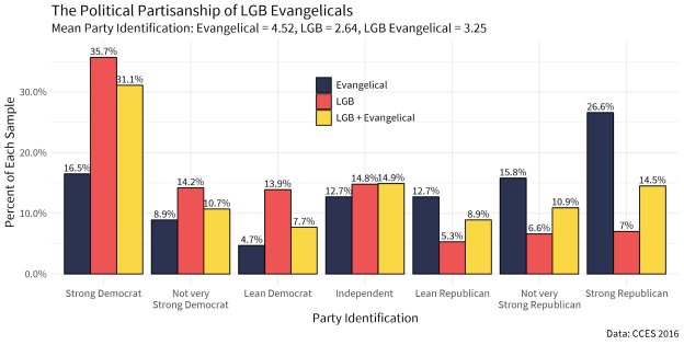If you would like to read the full article that includes a number of additional graphs and background literature on the LGB evangelical community, I published a paper in the journal Politics, Groups, and Identities. You can read the full text by clicking here.