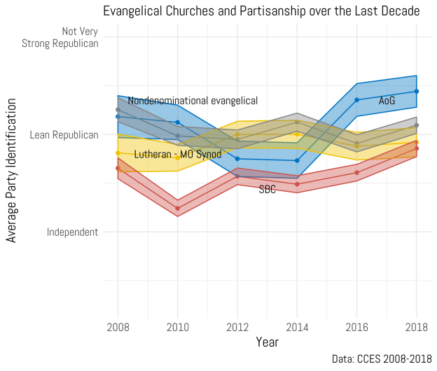 Taken together, this evidence strikes a blow to the argument that there is polarization among Protestant Christian traditions. Looked at here, the overwhelming narrative is that Protestants are more and more Republican every two years. What we may be seeing here is asymmetric polarization, which has been occurring in Congress now for decades. Those who study the ideology of members of Congress indicate that Republican have moved further and further to the right over time, while Democrats have moved much less to the left of the political spectrum. The shifts in the Democrats in Congress is mirrored by the religious nones as that group has been relatively stable in partisanship over the last ten years, although there has been a leftward shift in 2018. American religion is becoming more and more synonymous with the Republican Party while those who have no religious affiliation tend to be the (weak) base for the Democrats. If one wants to be an active Christian but disagrees with Republican politics, where do they go? Despite the fact that most Democrats do currently claim a religious affiliation, it seems that the places of refuge are dwindling every year.