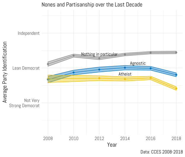 Finally, what about the nones? If all these Christian traditions are becoming more and more Republican over time there has to be a counterbalance somewhere, otherwise the overall partisanship of the country would have shifted more than 2% over the last decade. Just for reference, Agnostics and Atheists make up about 5% of the population, each, while the nothing in particular category is much larger at about 20%. Note how the “nothing in particulars” jumped significantly to the right between 2008 and 2010 and then have slowed drifted even more toward the Republicans since then. Atheists and agnostics show a different story entirely. The agnostic trend is a curvilinear one. They were closer to the Democrats in 2008 and 2018, but slightly more Republican between 2010 and 2016. On the other hand, atheists were rocky steady between 2008 and 2016, until lurching further toward the Democrats in 2018. This might be seen as a reaction to Donald Trump, which is also evident to a lesser degree among agnostics.
