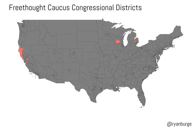 Researching this post led me to two surprising findings. First, there is actually a Freethought caucus. In a forthcoming post, I find that the anti-atheism sentiments are strong in the American public, and therefore it just seems odd that ten members of the House would hitch their wagon to a group that is viewed pretty negatively by the general public. Second, I noted how idiosyncratic the decisions were to join the Freethought caucus are. It seems that a few factors bind these ten people together. They are Democrats, they represent safe districts, and the districts are urban and very liberal. If you are a religious none and live in an urban district that is solidly Democratic, you might want to reach out to your member of Congress and ask if they will join the Freethought caucus. Now that there are ten members, they would have much more political cover than they would have enjoyed twelve months ago. The growth of this caucus is something to watch and could be the opening that atheists need to get one of their own elected.