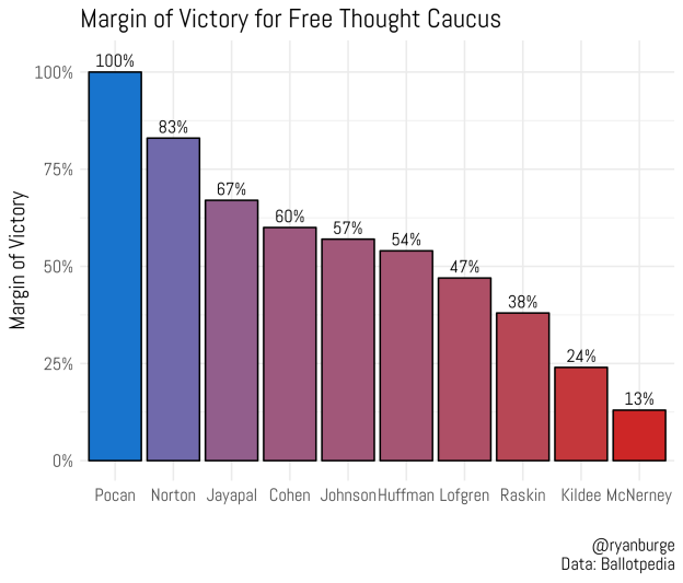 David Mayhew, one of the leading scholars of Congress, noted that members are singularly focused on reelection and that they increase their chances of keeping their seat by engaging in a number of activities including position taking. Using Mayhew’s framework would lead us to hypothesize that members who chose to join the Freethought caucus would do so because it would help (or at least not hurt) their chances at winning reelection. To investigate that I calculated the margin of victory for each member of the caucus in the 2018 midterm elections. That is displayed below.
