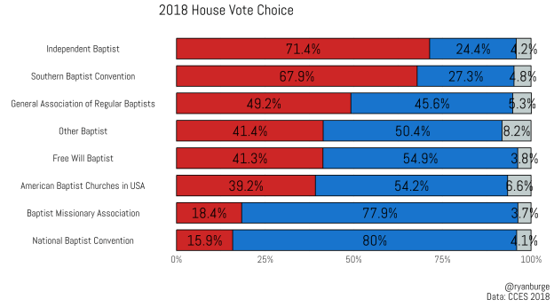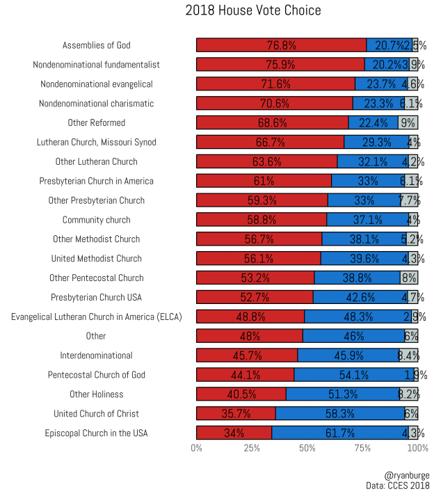 Finally, I wanted to visualize every other Protestant tradition that had at least 150 respondents. That is displayed above. The first thing that strikes me is how much red there is in the stacked bar graphs. There are 21 traditions included, and, of those, 14 traditions favored the Republicans over the Democrats – some by very large margins. This is especially true among nondenominational churches. The CCES breaks this group down into several subgroups and, as you can clearly see, each of them went at least 70% for the Republicans in 2018. Other solid red traditions were the Assemblies of God, the Lutheran Church – Missouri Synod, and the “Other Reformed” category. There were some churches that were not so enthusiastic about one particular party, though. Most notably, the United Methodist Church, one of the largest denominations in the United States, cast just 56.1% of votes for the Republicans. That’s slightly down from their 60% vote share for Donald Trump in 2016.