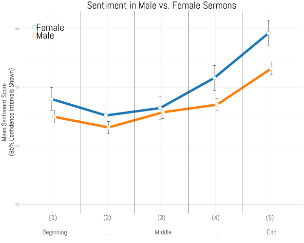 As can be seen, the differences in sentiment between the two genders is statistically the same in the first three sections of the sermon, and notice that the overall scores are relatively stable through this point of the message. However, as the sermon begins to move towards its conclusion, positive sentiment begins to climb for both genders, however the rate of increase is much steeper for women than it is for men. According to these results, female sermons become nearly twice as positive at the end of the message than they were in the middle. The increase for men is just half as much. It would appear that women do not want to leave their congregations on a sour note and fill up the conclusions with happy words and positive affirmations.