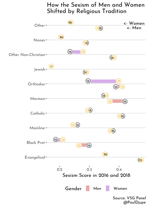 Maybe the most interesting shift was among Mormon men, however. In my previous post, the lack of a gender gap and the high degree of sexism from both Mormon men and women were surprising and lead to quite a bit of discussion, such as in this piece by C. Jane Kendrick. Well, as it turns out, there used to be a gender gap, but the time between 2016 and 2018 erased it. Mormon men’s sexism as measured by this scale dropped considerably (~5%) in those 2 years.