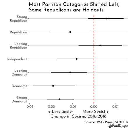 Perhaps the elephant in the room is partisanship. Religious groups are mostly not homogeneous politically, so perhaps the partisans are just polarizing on sexism, which may mute the apparent movement within religious groups. The figure below shows the movement from 2016-2018 among partisan categories.[1] No group shows significant gains in sexism, and most groups show signs of becoming less sexist over this time period. Strong and leaning Republicans are holdouts. Again, the amount of change is small – the greatest amount of change is just shy of 2% (Democrats).