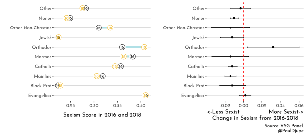 The figure in the right panel shows whether the change experienced by the religious group was statistically significant – is it distinguishable from no change (0)? There are only four groups that showed demonstrable change. Nones, Catholics and mainline Protestants all showed a decrease in sexism (less than 2%), while the Orthodox showed an increase (3.5%), and the non-Christian movement is not significant. None of these are large, but they are notable.