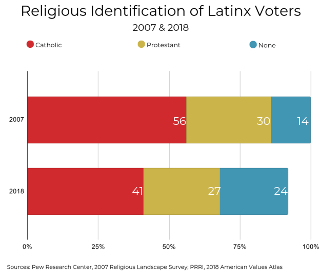 By 2018 the religious composition of Latinxs had drastically changed. Catholics comprise a plurality (45%) rather than a majority. One-quarter of Latinxs (25%) identify as Protestant. But the nones (23%) now are approaching the Protestant population in size. Among registered voters, Catholics represent 41%, Protestants 27%, and nones 24%.
