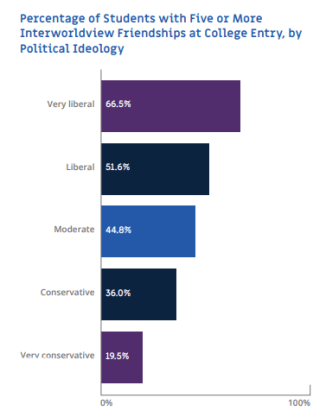 Colleges, though often characterized as hotbeds of polarization and political tribalism, seem to be an ideal setting for forging these diverse, interworldview friendships: 64% of the students who reported initially having no interworldview friendships when they started college reported making at least one within their first year. Interestingly, 20% among this group reported making five or more friends across worldview differences in that time.