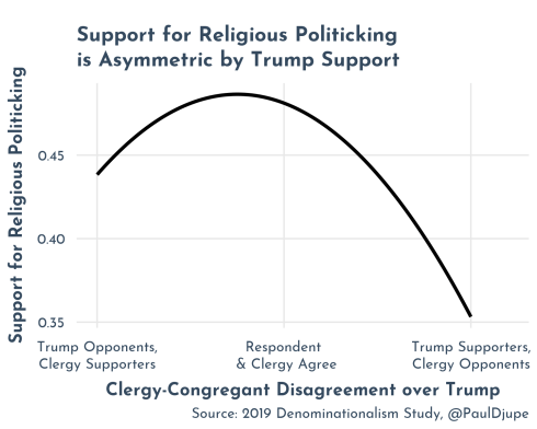 Support for religious politicking from congregations hinges on disagreement. As a shorthand for disagreement, I used the difference between feeling thermometers for Trump between the respondent and where they would place their clergy. The greatest difference in those figures drops support for religious politicking by 8 points compared to unity over Trump. However, the relationship is asymmetric between Trump supporters versus opponents. The figure below shows that Trump opponents who face Trump-supporting clergy (left side) have less support (~5 pts) for religious politicking than those who agree with their clergy (middle). But the least support for religious engagement is from Trump supporters who face clergy who are perceived to oppose Trump (~ 14 pts compared to those who agree). Surely the gap is accounted for by support for democratic norms, which is much weaker among Trump supporters, and dogmatism, which is higher.