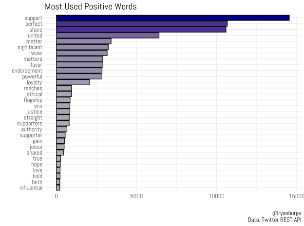 To give a sense of those positive and negative terms being used, I did a quick count of the top 25 words of each sentiment. Most telling is that the top two negative terms, “lost” and “confused” are lifted directly from the article. Galli writes that Trump is, “a near perfect example of a human being who is morally lost and confused.” Many of the other terms that show up in this list were also taken directly from Galli’s prose including “failure” and “danger.” However, “shocked” is one that was typically used as a reaction to this editorial. Many users were shocked that CT would take such a controversial stand.