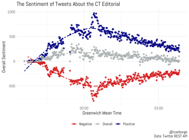As the velocity of tweets increased, so did the positive and negative sentiment of the terms being used. However, notice the gray line, which represents the overall word sentiment. Here we can ascertain that the sentiment, by and large, was tepidly positive. This stayed relatively consistent regardless of how many tweets were being sent per minute. However, it’s crucial to note that the overall sentiment began to move back toward zero as the evening wore on. This is some evidence that more negative voices were entering the discussion about the article.