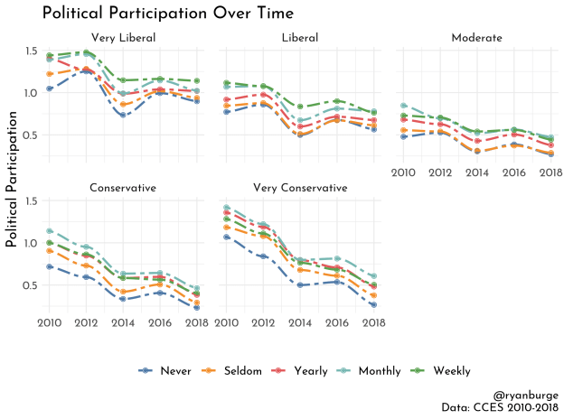 Is this pattern simply a function of 2018 politics, when there was much more to protest and get angry about on the left than the right? This is the essential dynamic driving midterm elections where the incumbent president’s party tends to lose seats (and Trump was no exception of course). The figure below gives us a view back to 2010 using the CCES series. There are only 4 political activities to make this index, which explains why the figures are a bit lower. The pattern is remarkable – political activism has been declining across the board through his period, but less so among liberals. In fact, Trump’s election appears to have kept the activism of the religious left afloat. So, no, the high activism of the religious left (and liberals in general) is not limited to 2018, but Trump’s election does appear to have enlarged the gap.