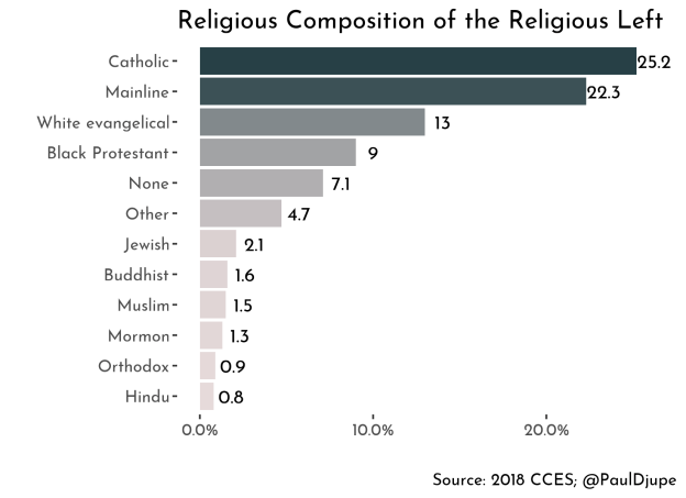 It’s important to put these numbers in perspective, though. While ~5% of people can be classified as the religious left, that’s just one third of the size of white evangelicals or one sixth the size of the religiously unaffiliated. That’s not to say that they can’t have an impact on politics, especially at the state and local level, but it’s fair to say that they cannot match the size and power amassed by the religious right.